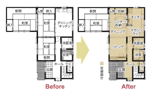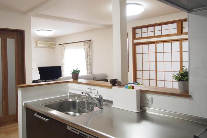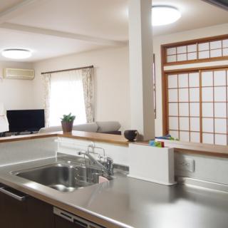 お昼でも電気をつけていないといけない程暗い印象だったお部屋の中を、なんとか明るくしたいとの想いから、アイスタイル店へご来店いただいたH様ご夫妻。併せて水まわりのリフォームも検討されておりました。 色々なお話を伺う中でも特にLDK空間へのこだわりをお持ちで、南面に三間あった和室のうち、ニ間を洋室へ変更、キッチンとつなげて広々としたLDKにしたいとのご要望がありました。 LDKのレイアウトプランもいくつかご提案させていただく中で、キッチン腰壁へのマガジンラックやニッチ収納を取り入れて頂くことに。LDK空間のアクセントとなり、おしゃれな雰囲気も演出しています。 たまに里帰りされる娘さん家族と親子三世代で、仲良く楽しい時間を過ごしてもらえる、そんなリフォームとなりました。