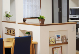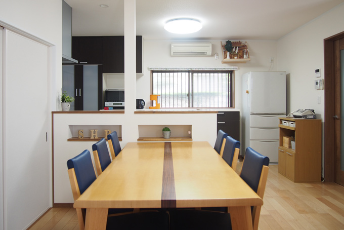 造作したニッチに合わせてダイニングテーブルを配置。お料理をする奥様とお孫さんを連れて遊びに来る娘さんとも、会話を楽しみながら楽しい時間を過ごしていただけるでしょう。