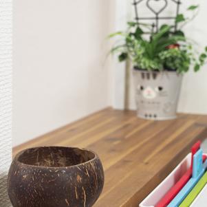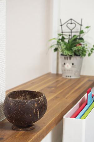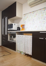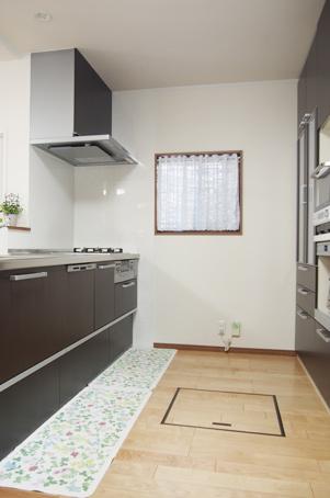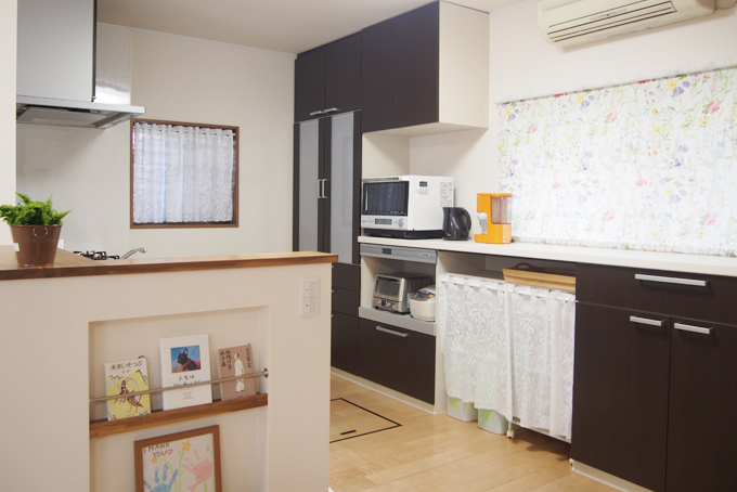 システムキッチンはクリナップのラクエラをチョイス。既設の窓を生かした大きめのカウンター。収納の一部は市販のゴミBOXを設置できるようオープンに。色は落ち着きのあるダークウッドで統一しました。