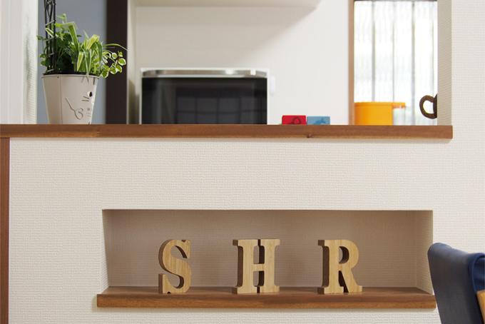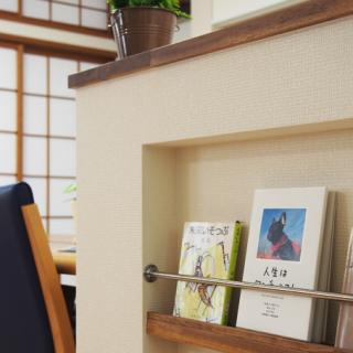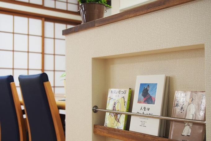 キッチン腰壁にはマガジンラックとニッチ収納を設置。ニッチ収納はお使いになるダイニングテーブルに合わせて高さを調整しました。