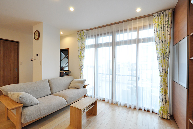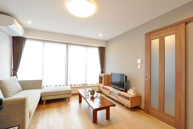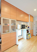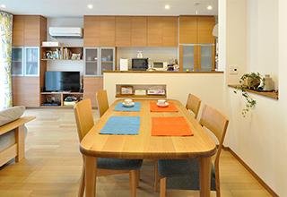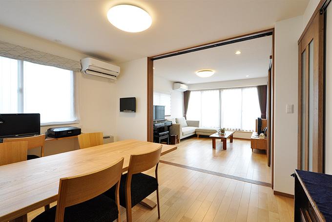 以前はホールと和室に分断されていた壁をなくし、広々としたLDKを実現。統一感を出すために、リビングボードは、キッチン背面収納とメーカーを合わせ扉をおそろいに。床暖とインプラスの効果で、大空間でも保温性を保ちます。