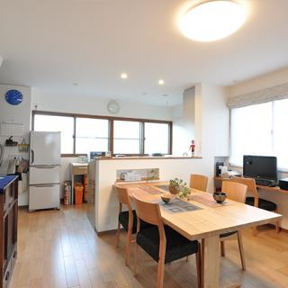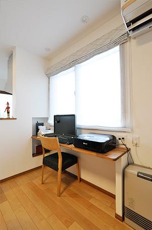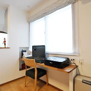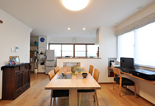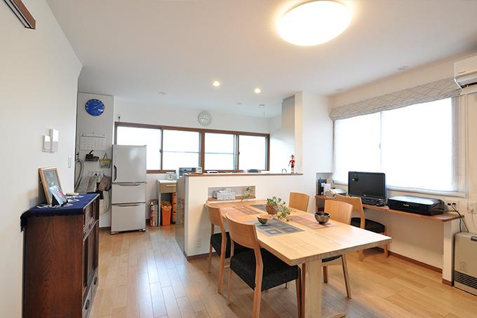 1Fのダイニングもテーブルに合わせたニッチ収納をつくりました。窓側の一角にはPCカウンターも設置。