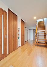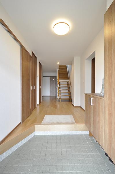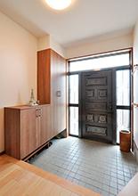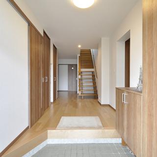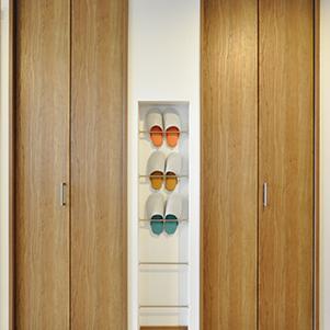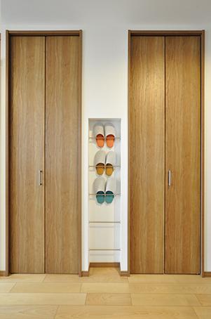 以前は物入れが出っ張っていて階段との間が狭かった玄関ホールは、洋室を広げた壁と収納の奥行きと揃えて、壁がスッキリ見えるように。収納と収納の間にはスリッパ置き、玄関収納は扉と同じカラーで新設。