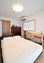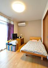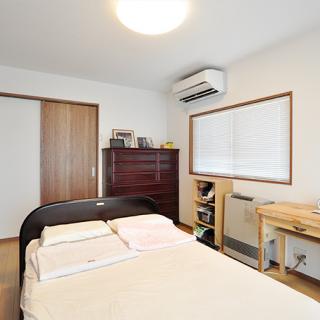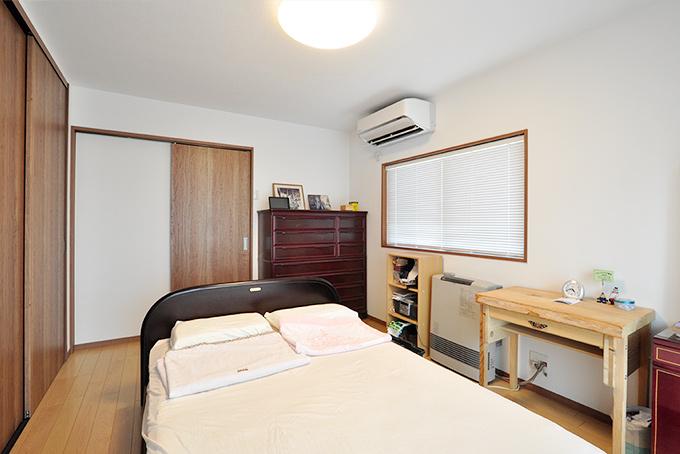 南側の明るいお部屋を広くして、お母様のご寝室に。ベッド背面にはグレー調の落ち着いたアクセントクロス。床暖とインプラスも完備して、安全で快適なお部屋となりました。