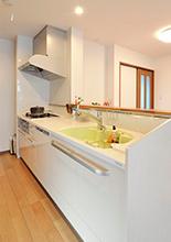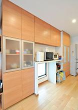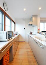北側壁面にあったキッチンを対面キッチンに。北面の大きな窓が隠れないよう、背面収納はカウンタータイプのものを設置。キッチン隅にはL型のオープンパントリー。様々なキッチン用品やストック類の収納ができます。