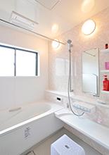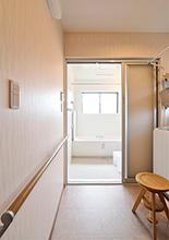 お母様も使用する1階浴室は、浴室暖房乾燥機の導入、引き戸と広さにこだわり、1818サイズとしました。バリアフリー対応でほとんど段差もありません。