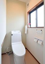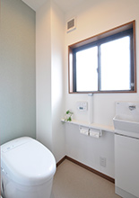 お母様も使用する1階トイレは引き戸に。水縹(みはなだ)色の和調アクセントクロスも粋です。