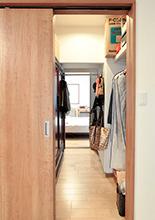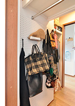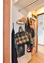 LDKから通り抜けて主寝室へ行けるWICは、どちらの部屋からも荷物を取りに行けて便利。一部の壁には有孔ボードを設置。バックなどを掛けるのに重宝して頂けました。