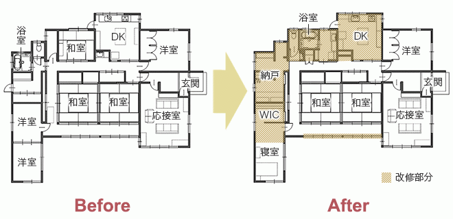 | リフォーム箇所 | ダイニング、キッチン、浴室、洗面室、トイレ、納戸、洋室、和室、ウォークインクローゼット |