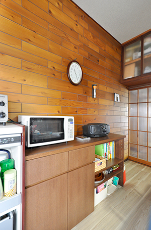 以前よりコンパクトサイズして移動が楽になったキッチン(クリナップ/クリンレディ/W2550)。お気に入りだった壁の板貼りはそのまま活かし、床はオフホワイトのアッシュ柄のフロアタイルを選択。本やトレイ、キッチン用品などがしまえる造作収納もつくりました。