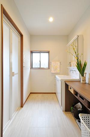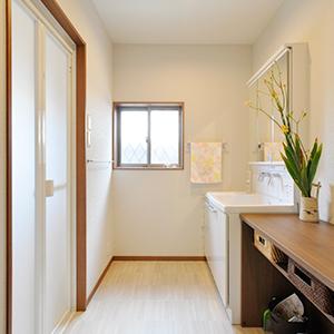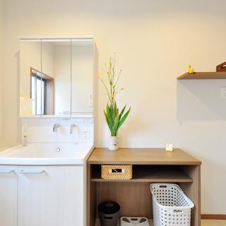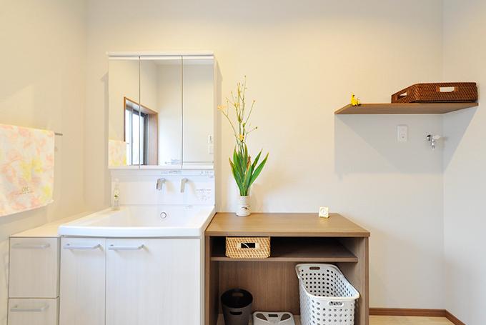洗面化粧台(TOTO/サクア)の右側にカウンターを造作。上は着替えや洗面時のタオルを置いたり、下は洗濯カゴやダストボックス置き場として利用しています。入口横には可動棚収納を造作。ロールスクリーンで目隠しできるので、洗剤やタオルなどストック品がたくさんあっても大丈夫。