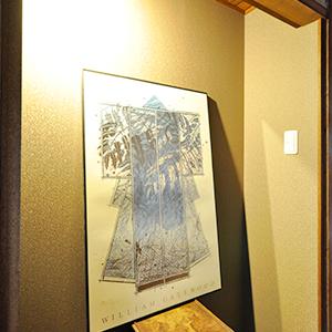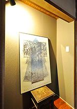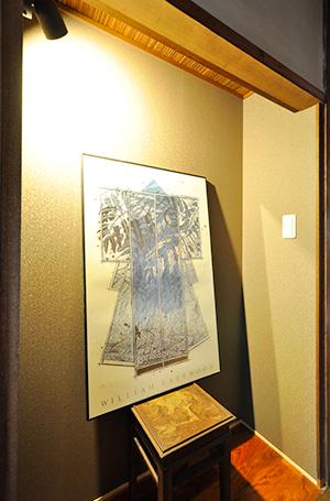 廊下にあったミニ洗面化粧台は撤去して、代わりにギャラリースペースに。落ち着いた和を感じるアクセントクロスに貼替え、スポットライトも設置しました。