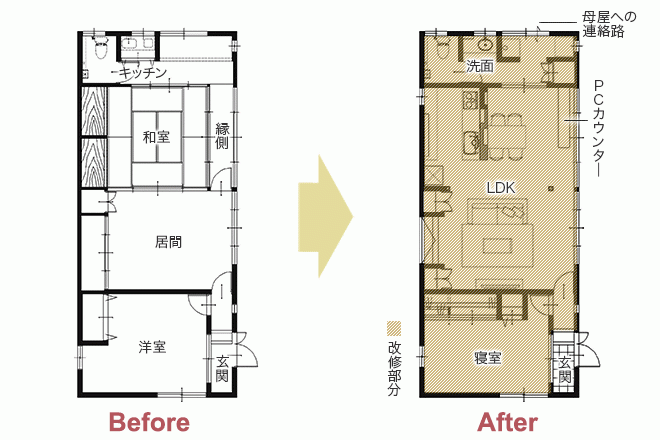 第一子を授かったタイミングでご実家に戻り、二世帯同居を決断されたご主人。敷地が広く母屋のほかにご両親が寝室として利用していた離れもあったため、そちらをリノベーションして子世帯の住まいに。浴室のみを共有する二世帯住宅としました。