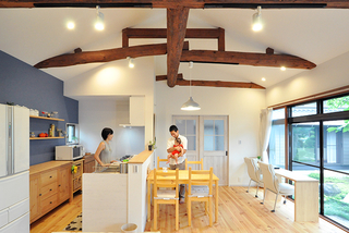 築30年、平屋建ての離れは、勾配天井にすることであらわになった立派な梁を生かしてノスタルジックな佇まいに。耐震補強と断熱対策、風通しも改善し、木のぬくもり感じる子育てにもやさしい住まいへと生まれ変わっています。