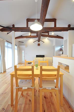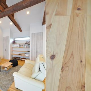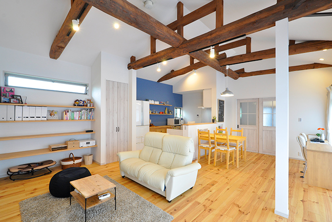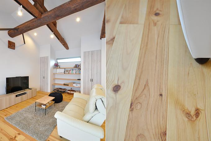 勾配天井にして露わになった丸太梁は、ムラがなくなるようブラウンに塗装。床は木目が美しいパインの無垢フローリングにして木のぬくもり感じる空間に。本棚を挟んでシンメトリーに配したリビング収納(LIXIL/パレットシリーズ)は、床材と合わせてホワイトオーク調の扉を選んでいます。