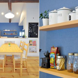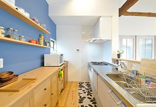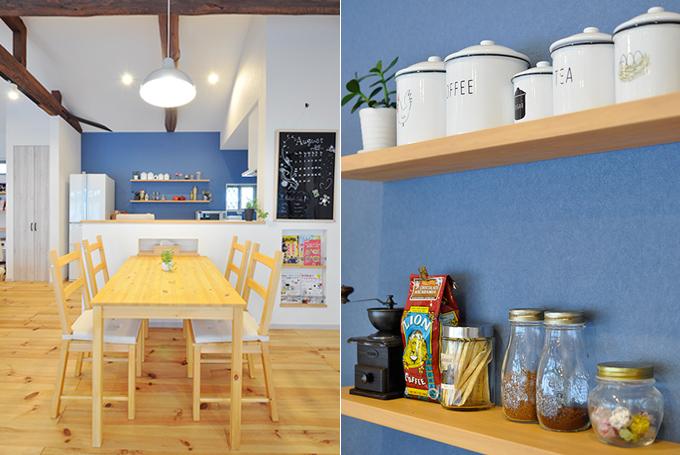 事例No.155のキッチンまわりを参考にした背面収納は、趣きのある梁とのバランスを考えて、濃いブルーのアクセントクロスを選択。システムキッチンはクリナップ/ラクエラにして対面型に。カウンターに設けたニッチは調味料入れです。