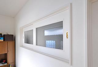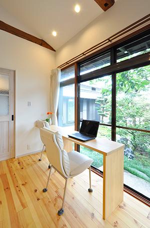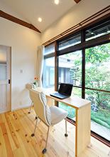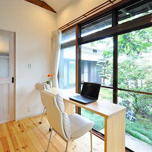 リビングダイニングの一角にPCカウンターを造作。窓からは隣接する母屋と素敵な日本庭園が眺められます。二重サッシ(インプラス)にして断熱性もアップ!