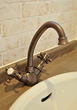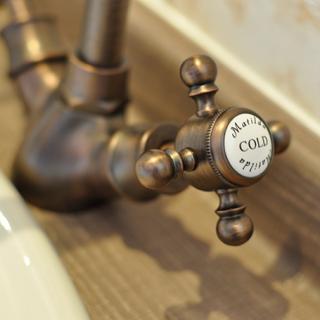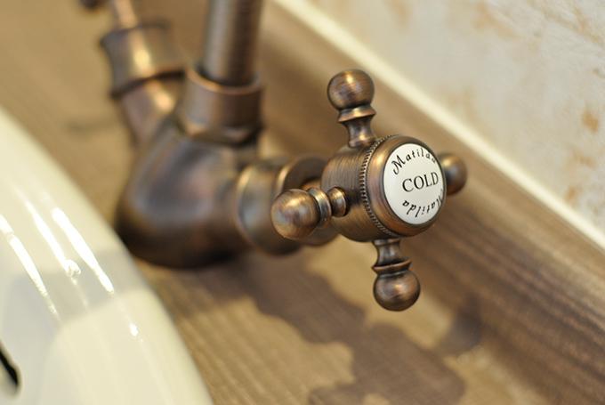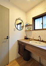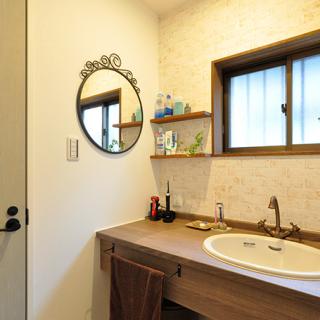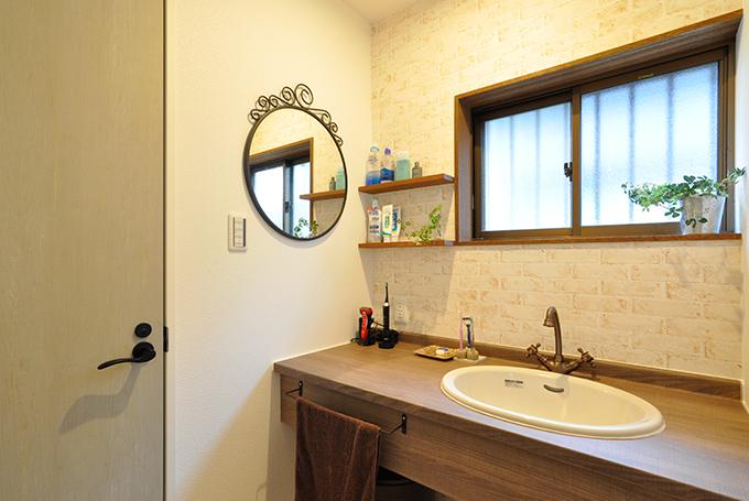 洗面は真鍮水栓を取付けレトロな雰囲気に。既設の窓枠に合わせて、木目調の洗面カウンター(アイカ/ポストフォームカウンター)にしています。