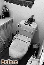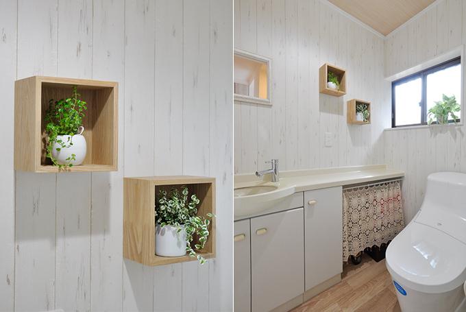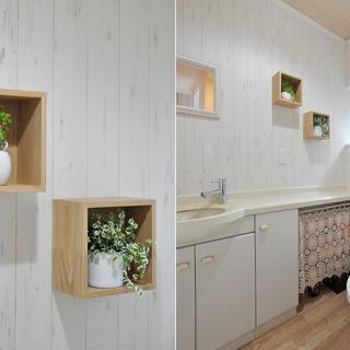 壁は羽目板調のクロスに貼替え、ディスプレイ用の棚を2箇所に設置。グリーンのトイレドアと合わせて一面はボタニカル柄(植物柄)のクロスでアクセント。既存のカウンターを生かしつつ、ナチュラルな雰囲気に。便器はLIXIL/アメージュに新設しています。