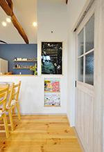 オイル塗装されたダイニングテーブルは、組立からペイントまでご主人がDIYで作り上げた力作。洗面やトイレへとつながる引違い戸は、リビング収納と同じLIXIL/パレットシリーズ。キッチンとの間にある壁にはマガジンラックとBOXティッシュ用のニッチを設置。壁掛けされた黒板でおしゃれ度もアップ!