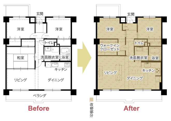 和室をなくし、ウォークインクローゼットとリビングの一部に取り込んで、LDKを拡張。