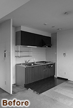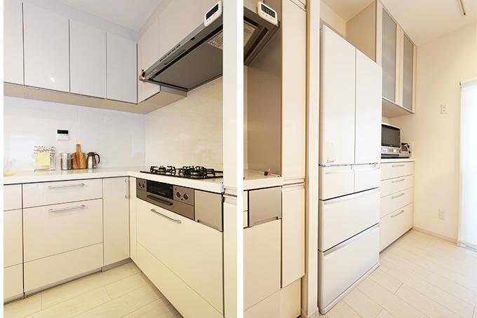 キッチンの向きを変えて対面式にすることもできたが、出入りの動線が長くなってしまったり、床が上がってしまったりとデメリットがあった。もともとお風呂以外段差がなく、バリアフリーをご要望だったので、キッチンの向きは変えず、I型→L型に。収納力がアップし作業スペースも広がった。カウンター式の収納は配膳にも重宝。ゴミ箱もLDから見えずスッキリ片付く。