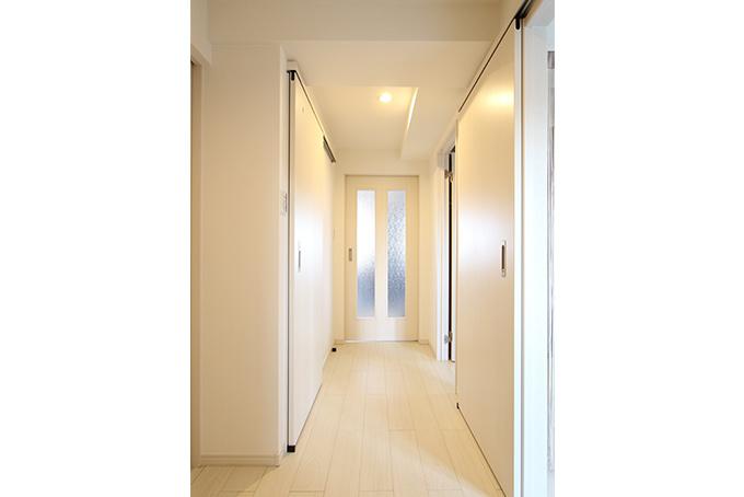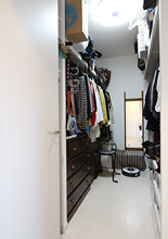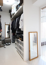 寝室と廊下の両方から入れるよう出入り口を2ヶ所確保。ご夫婦のお洋服が一箇所にまとめて収納できるように。もともとお持ちだったタンスに合わせて壁や棚を作ることで、無駄な空間がなくなるよう工夫。