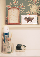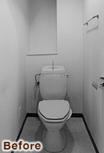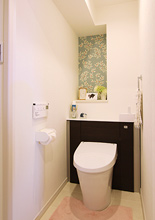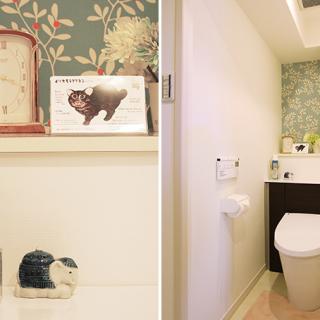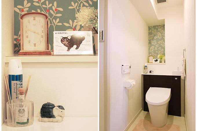 タンク部分がキャビネットで隠れた、LIXILのリフォレに取替え。拭き掃除が楽になり、収納も確保できた。もともとついていたカウンターは生かし、壁の凹み部分のみ柄クロスを貼り、小物を飾れるスペースに。