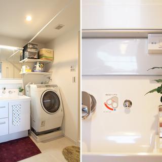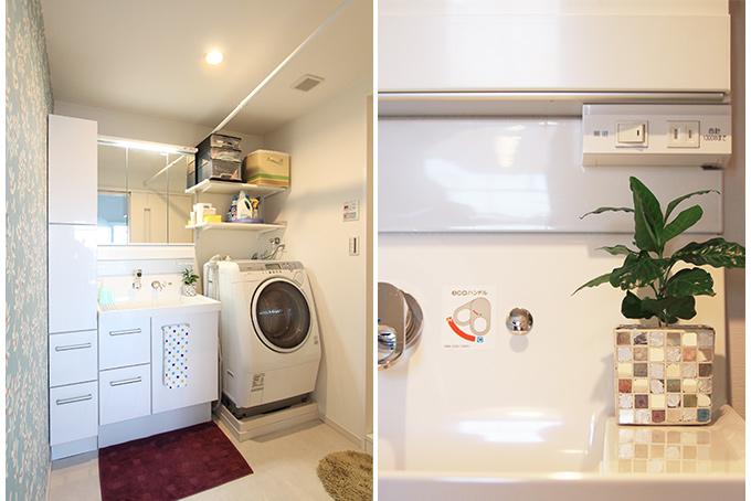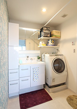 洗面化粧台は同じ間口でも収納量がアップする引き出しタイプに。洗濯機パンを小さくし、洗面台横にトールタイプの収納も設置。小物類の収納に便利。洗濯機上にも可動棚をつけ、空間を有効活用。