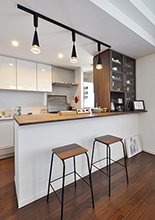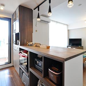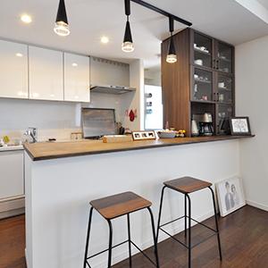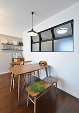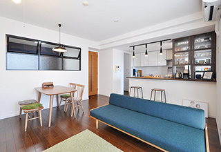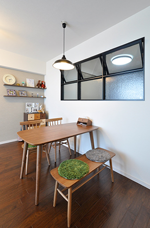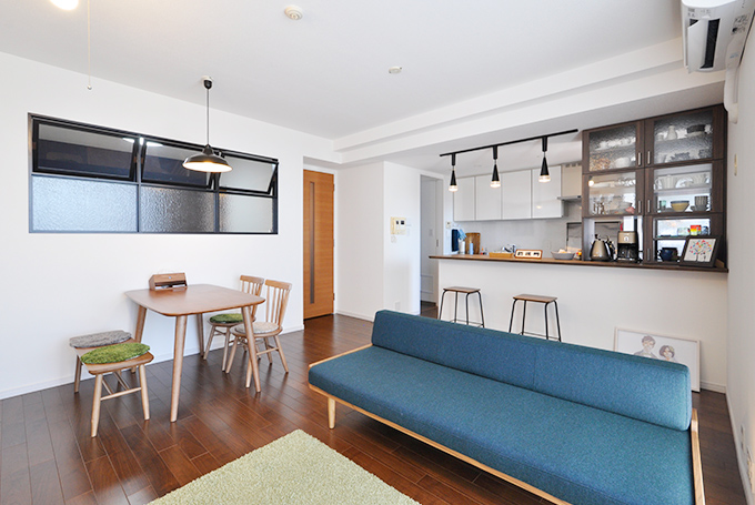 築浅の中古マンションを購入し、自分たちの思い描く内装へとリノベーションされたI様。キッチンや浴室など、まだ使える設備はそのままに、床材や壁材をツルっと変える表層替えで、北欧風の内装へと大変身!黒フレームが印象的な室内窓や、アクセントウォール、オリジナルのキッチンボードなど、I様のセンスでグッとおしゃれな住まいに仕上がっています。