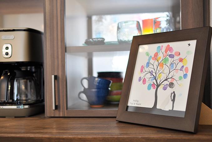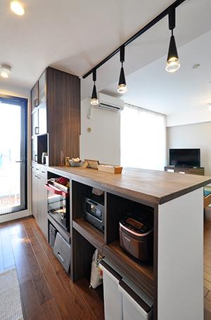 見せる収納と隠す収納。キッチン側とリビング側で見た目も機能もガラッと変わるオリジナルのキッチンボード。カウンターの天板はオイル塗装仕上げにして触り心地を重視しています。