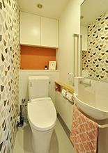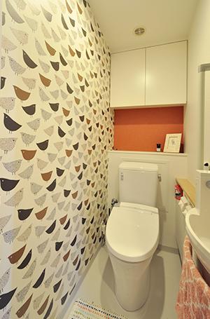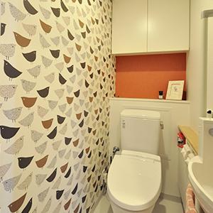 トイレはLIXILのアメージュZ(フチレス)に交換し、壁紙と床を貼替え。アクセントクロスは北欧風の鳥柄にして遊びゴコロのある空間に。