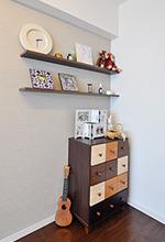 リビングはフローリングを朝日ウッドテック(ライブナチュラル/ネダレス95)に張替え。西面の壁は淡いグレーのクロスに飾り棚を取り付けています。