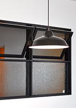 窓枠はデザイン性・機能性を考慮してスチールを採用。上部は風が流れるよう回転窓にしています。ガラスは上部・下部と変えることで、採光とプライバシーの両方をカバー。