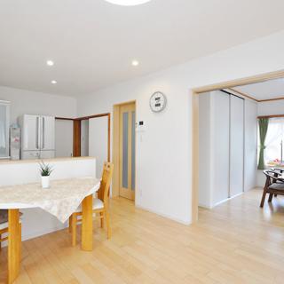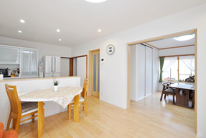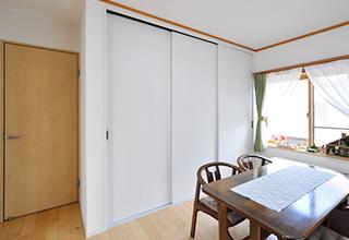 和室から洋室へとリフォーム。ご親戚が集まった際はLDKとつなげて、テーブルを囲んで大勢で食事ができます。将来、2階への上り下りが困難になった場合は、こちらにベッドを置いて寝室に変えることも想定。