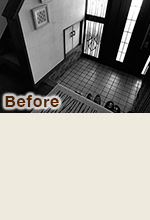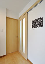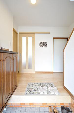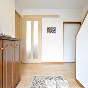 玄関ホールは明るい色味のフローリングに張替え、クロスも一新。リビングとつながる正面の建具も新調し、天井が高く感じられるようになっています。