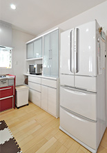 セミクローズドで狭く感じていたキッチンは、垂れ壁をなくして開放的なセミオープンに。お孫さんが遊びにきた際は、一緒にキッチンに立てるよう、作業スペースが広いL型のキッチン(クリナップ/ラクエラ、L1500×2550)を採用。シンク・コンロ・冷蔵庫とが三角形で結ばれ、二人並んでもお互いにストレスなく調理ができます。