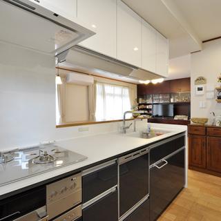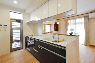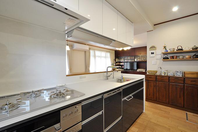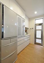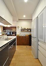 お料理やお菓子作りがお好きなK様。Ⅱ型からⅠ型のシステムキッチン(TOTO/ザ・クラッソ 2550)に取替え、ビルトインオーブン(リンナイ/コンベック)も導入。豊富にストックしている製菓材料やキッチングッズが、使いやすく片付けやすいよう背面は天井まである大容量の収納(クリナップ/クリンレディ1800)にしています。