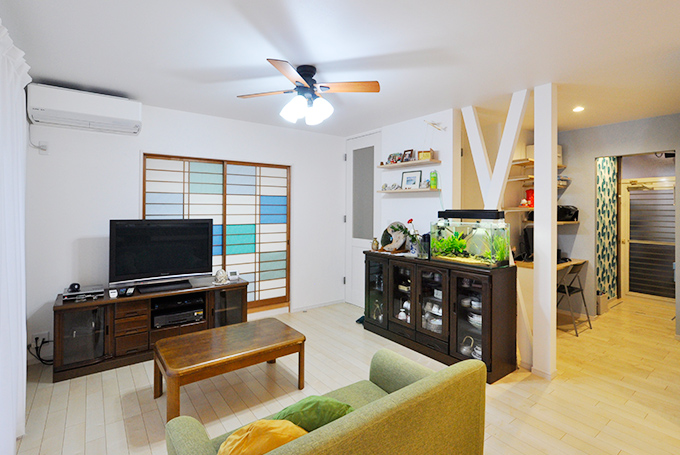 リビングと畳コーナーをつなげてLDKに。不要な建具は取り除き、筋交いをあらわしにして書斎コーナーとつながりを持たせています。あえてドアをなくすことで、パントリーへもスムーズに移動できます。