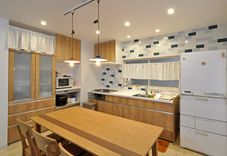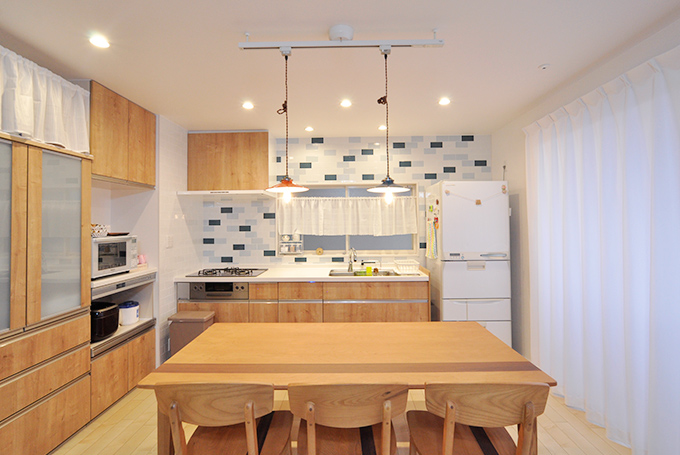 キッチンは、LDKをできるだけ広く使えるように壁付けタイプを採用。キッチン(LIXIL/アレスタ 2550)は木目調の扉に食洗機は操作盤が見えないタイプにして、ダイニングテーブルと雰囲気を統一。青と白のキッチンタイルでアクセントをつけています。L字に食器棚を配した使いやすいレイアウトです。