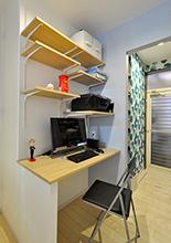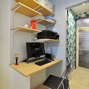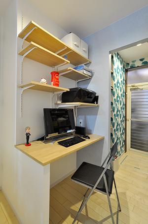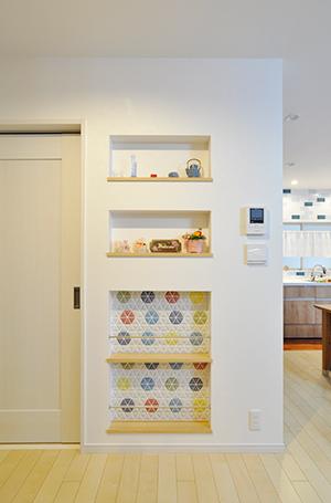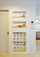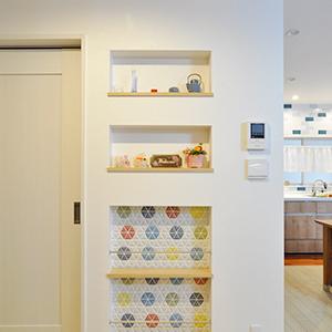 リビングとパントリーの間は書斎コーナー。PCカウンターの上は可動棚にして、プリンターや書類などが置けるようになっています。背面には小物や雑誌が飾れるニッチを造作。色鮮やかなタイルを組み合わせて、見た目にも楽しい雰囲気に。