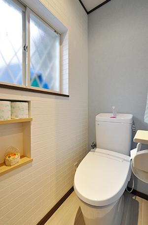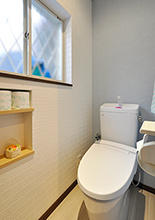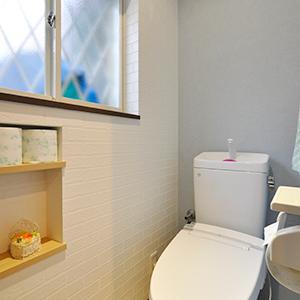 トイレは、フチレス形状の便器(LIXIL/アメージュZ)に取替え、日々のお手入れを簡単に。既存の収納を撤去して、トイレットペーパーや小物が置けるニッチを造作しています。