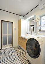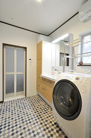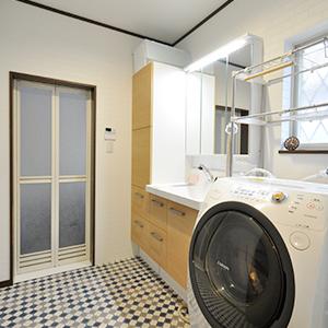 収納不足が補えるようトールキャビネット付きの洗面化粧台(LIXIL/ピアラW1500)に交換。床はレトロなタイル調のクッションフロア、壁は水色×白レンガ調のクロスを貼り分け、可愛らしい雰囲気にまとめています。暖房乾燥機も設置しているので、雨の多い日などは室内干しもできます。