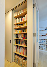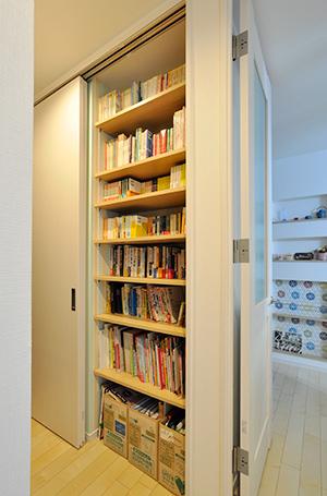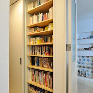 廊下には建具付きの本棚を設置。天井いっぱいまでの大容量収納です。