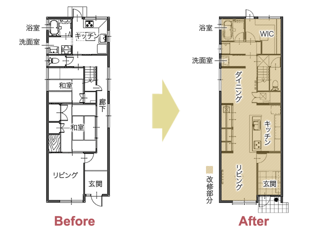 駅近で奥様のご実家にも近い好条件な立地に中古住宅を購入されたI様。その住宅は南北に細長く、純和風の内装、水まわりは北側に集中している間取りで、ライフスタイルに合わせて変えたいと思ってはいたものの、「どのようにリノベーションしたらいいのか?」とお悩みでした。