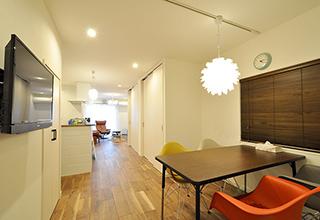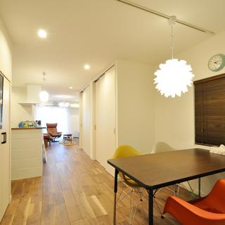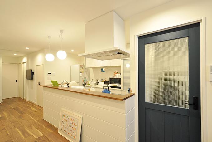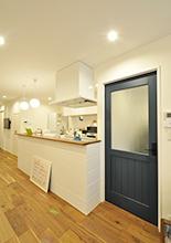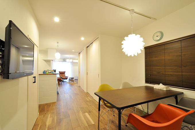 間取りはそのままに内装をキレイに刷新。床暖房も導入し広いLDKですが、温かく家族団らんを時間を楽しめます。玄関へとつながる扉は色を変えることで部屋のアクセントに。