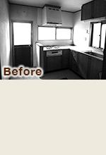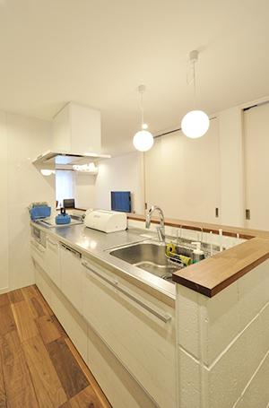 北側の孤立した場所にあったキッチンを住まいの中央へと大移動。空間が広く感じられるだけでなく、リビング・ダイニングの間に位置するので、コミュニケーションも取りやすくなっています。システムキッチンはクリナップ/ラクエラ(コンフォートⅠ型 W=2550)。腰壁はコンクリートブロック+塗装で仕上げてアクセントに。