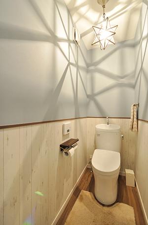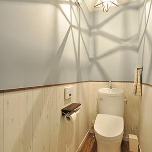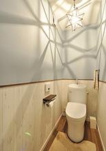 もともと長い廊下だったスペースを有効活用しトイレを配置。トイレは壁クロスを2種類に貼り分けて好みのイメージに。便器は手洗い器付きのピュアレストEXを選択。お掃除の手間も軽減されます。