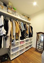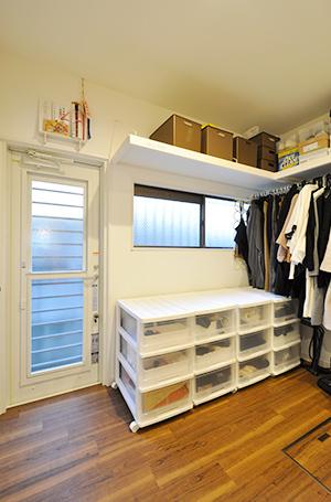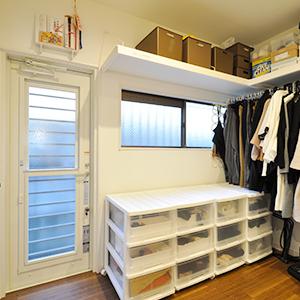 以前キッチンがあった北側は、まるっとウォークインクローゼットに大変身。ご家族分の着替えもすべて収納でき、衣替えから着替えも行えます。