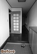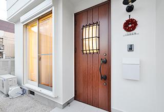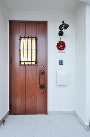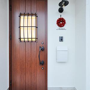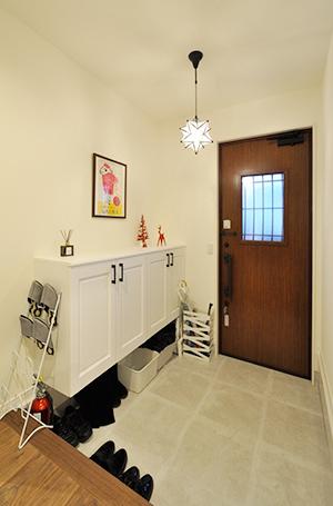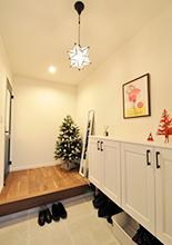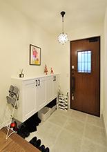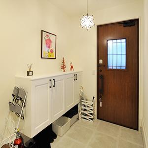 明るく洋風なイメージへと一新。玄関扉はウッドワン/ピノアースチェッカーガラスS-SCと、収納はウッドワン/ソフトアートを選び、木の温かみの感じる空間に。